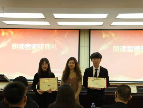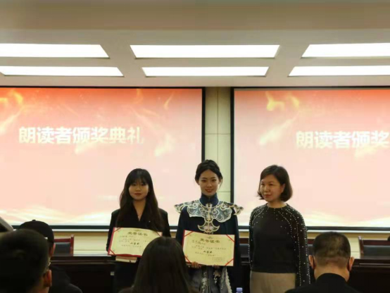 决赛历时两个小时,经过激烈的角逐,大赛产生一、二、三等奖各1组,优秀奖三组。一等奖马婷玉、王宇宁朗读的作品《等待》,这是为“两弹元勋”邓稼先先生所作,男生铿锵有力的声音充分反映出邓稼先工作环境的艰难困苦、阻力重重,女生温柔的语气充分展现了许鹿希身为人妻的体贴与自豪,也透露出身为人母的无奈与落寞,朗诵者的相互配合,完美演绎了邓稼先夫妇为国奉献的旷世大爱;二等奖云程圆、贾紫越朗读的作品《昭君出塞》,选手妆容精致、服饰精美,现场观众未闻其声,已身临其境。选手脱稿朗诵,饱满的感情更是将昭君离国时的是不舍与绝望生动还原,同时又将虽为女儿身却仍有一身壮志报国的情怀展示到位;三等奖王睿智、杜嘉鹏朗读的作品《生死之间》,选手感情细腻、代入感强,真挚地表现了作者忆母亲的深情,满怀生者对死者的怀念;优秀奖分别是耿冉、青和勒的《告别青春,诚致自己》、侯文姝、范童砚的《赵一曼留给儿子宁儿的绝笔信》以及乌云其木格、孙晓妮的《雪山的长夜》。