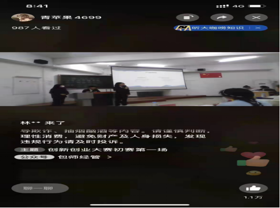因疫情原因,大赛采用线下与线上直播相结合的模式进行,充分利用互联网的优势,吸引更多人参与到本次大赛中来。全校的23组团队参加比赛,特邀丛丽娟、刘晓庆、李金涵、冯向一、苏跃担任评委。活动最后,共十组团队进入决赛。未入围的团队表示,总结经验,明年再战。