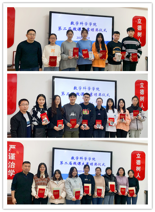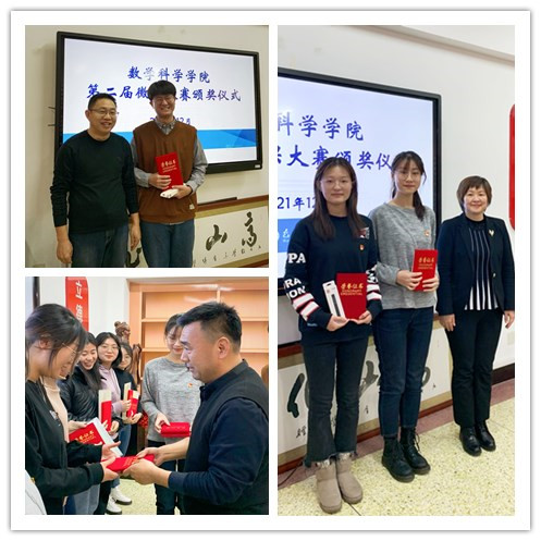 12月16日,数学科学学院第二届微课大赛颁奖仪式在学院会议室顺利举行。学院党总支书记朱丽、院长赵国忠、副院长徐国明及董金茂、王丽花、宋金锦等老师参加仪式,并为获奖学生颁奖。