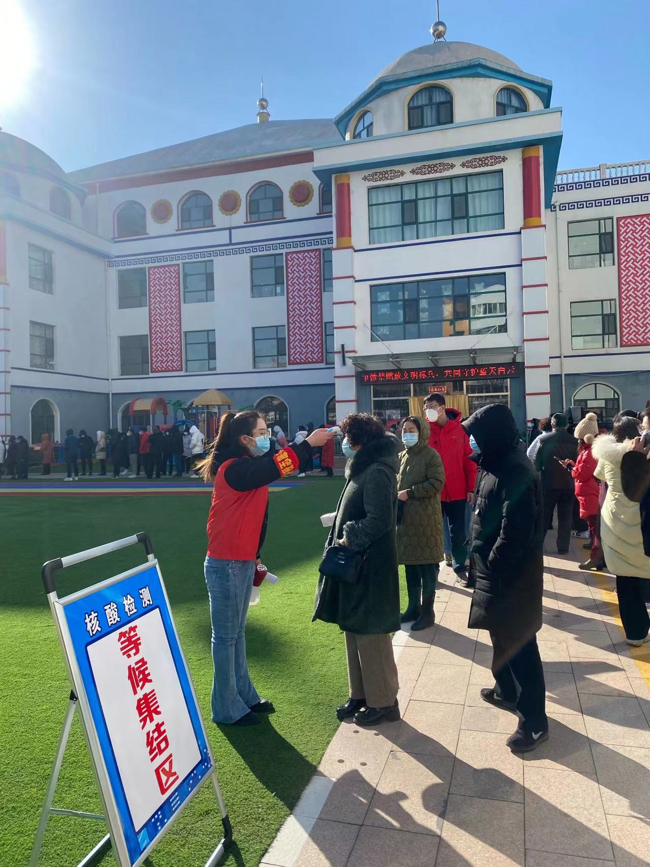20级思政专业王潇蕾同学在核酸检测现场进行体温测量(包头)