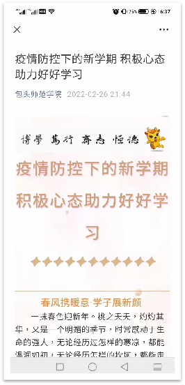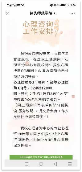 校心理咨询中心积极配合学校疫情防控工作,结合我校学生暂缓返校的实际情况,第一时间开展学生心理援助服务,为师生提供心理援助QQ和网上心理咨询预约两种预约咨询渠道。并在学校官方微信公众号推送文章“疫情防控下的新学期,积极心态助力好好学习”,介绍疫情防控状态下心理调节小技巧,助力广大师生用“心”战疫。