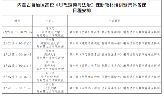 2022年2月24日---3月4日,思想道德与法治教研室全体教师参加了内蒙古自治区高校《思想道德与法治》课新教材培训暨集体备课会。此次活动是内蒙古教育厅“思想道德修养与法律基础”分教学指导委员会组织进行的一场全区思政课教师参加的集体备课会。此次会议在线上进行,打破了时间和地域限制,所有教师都可参加,参会教师聆听了来自北京大学、北京政法大学、北京师范大学、中央财经大学、南开大学、同济大学六位教授们做的六场专题讲座。