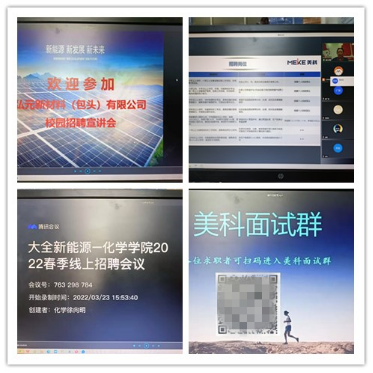 从3月22日开始,学院正式启动为期一个半月的企业线上招聘宣介会(企业归属地为板块),招聘企业涵盖新能源、新材料、医药、煤化工等行业,共52家企业参与此次线上招聘活动。截至24日,学院共组织了包括新特能源、鄂尔多斯电力冶金集团、美科硅能源、大全新能源、鑫元硅材料、弘元新材等企业在内的6场线上招聘宣介会,学院网格化成员全程参会。