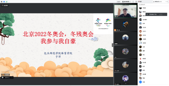 于洋老师与同学们分享了自己在冬奥会担任冬季两项NTO的工作历程和为期52天连续闭环工作生活的感受。于洋老师表示,中国特色的奥运理念中,包含了当下中国人民乐观向上的精神风貌、奋勇拼搏的昂扬斗志、开阔包容的胸襟气度,以及对人类共同文明的崇尚和发扬、对民族文化的强烈自信。希望同学们作为包师体育人,要弘扬冬奥精神,坚定拼搏信念,一起向未来!