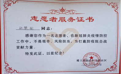 2021级生物学研究生赵鑫自告奋勇参加疫情防控志愿者活动,只是为了贡献出自己的微薄之力。在疫情志愿工作期间,他主要的工作内容是进行行程码、健康码的排查以及体温测量等工作,他对待志愿服务工作认真负责,积极配合志愿服务单位的任务分配。