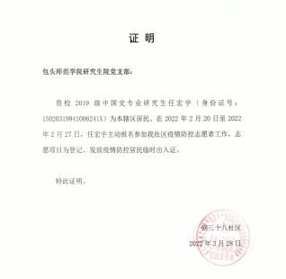 21级中国史专业的研究生那日苏于2月20日到3月1日期间,参与包头市九原区麻池镇北新社区阳光小区南核酸检测工作,先后进行了核酸检测演练、入口处测温引导、核酸检测信息录入、入户核酸检测、小区出入口防控等志愿活动。