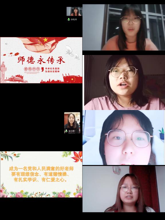 师范生是教师队伍的后备力量,加强师范生师德师风建设,是落实“立德树人”根本任务的关键,是促进师范生全面发展的现实需求,更是促进中国教育事业健康发展的必然要求。为进一步提高学院师范生的师德素养,4月7日晚19时,教育科学学院以线上方式举办了“秉承师范特色,加强师德师风”演讲活动。参加本次活动共33名学生,活动由辅导员王璐然及三位学生干部担任评委。