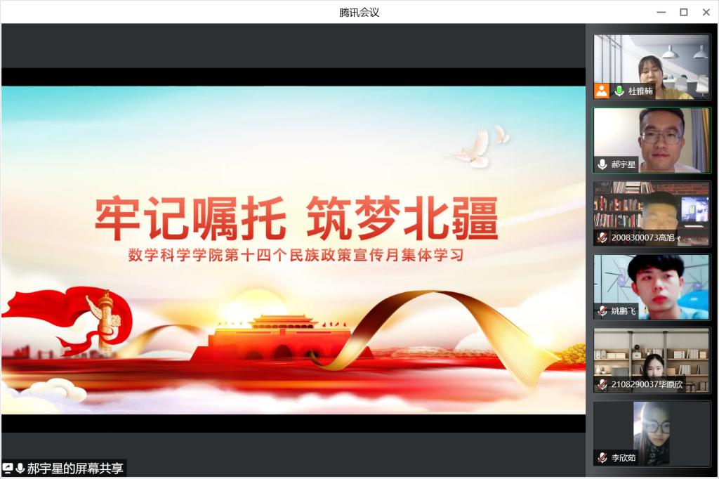 中华民族一家亲,民族团结是全国各族人民的生命线,铸牢中华民族共同体意识是民族团结之本。每年5月是全区“民族政策宣传月”,根据《包头师范学院关于开展第十四个民族政策宣传月活动方案》精神,数学科学学院于5月20日晚组织了以“牢记嘱托,筑梦北疆”为主题的线上集体学习,辅导员郝宇星带领全体学生党员和学生干部参加了学习。