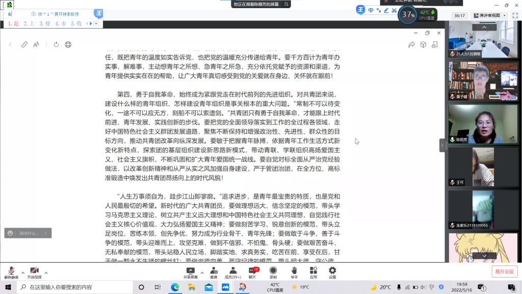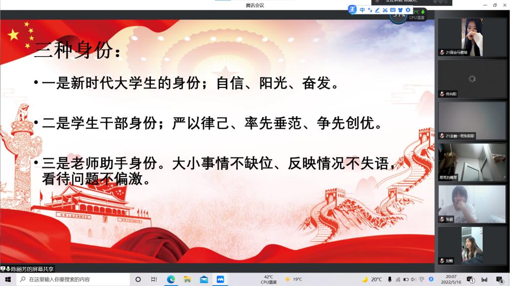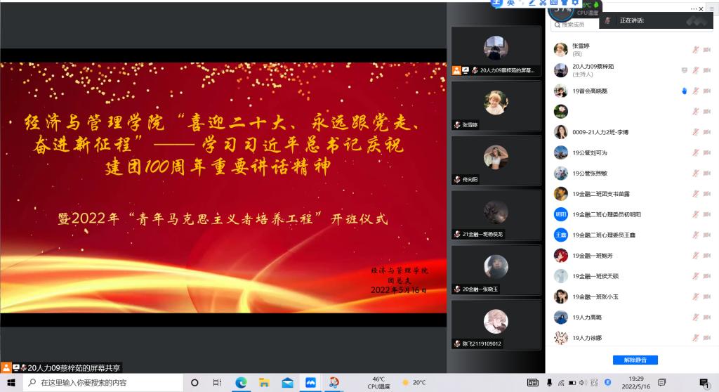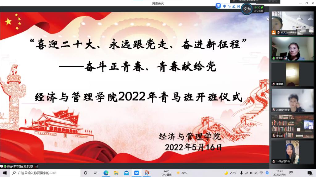 为迎接党的二十大,深入贯彻落实习近平总书记关于青年的重要思想工作,强化对青年一代政治理想的塑造与培养,5月16日晚7时,经济与管理学院团总支举行“喜迎二十大、永远跟党走、奋进新征程”——学习习近平总书记在庆祝建团100周年重要讲话精神暨2022年“青年马克思主义者培养工程”开班仪式。活动由学院团总支书记陈丽芳老师主持,2019级、2020级、2021级所有学生干部参加。
