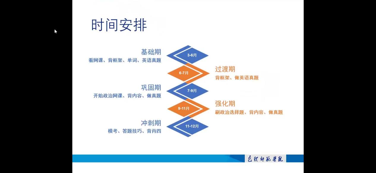 最后分享的是2018级小教三班张宣(考研分数:413,考研学校、专业:东北师范大学小学教育专业)就自己的考研情况、时间安排、学习方法、心态调整进行阐述。她提出英语学习方面单词是基础,要有效利用碎片化时间进行单词背诵并贯穿始终。