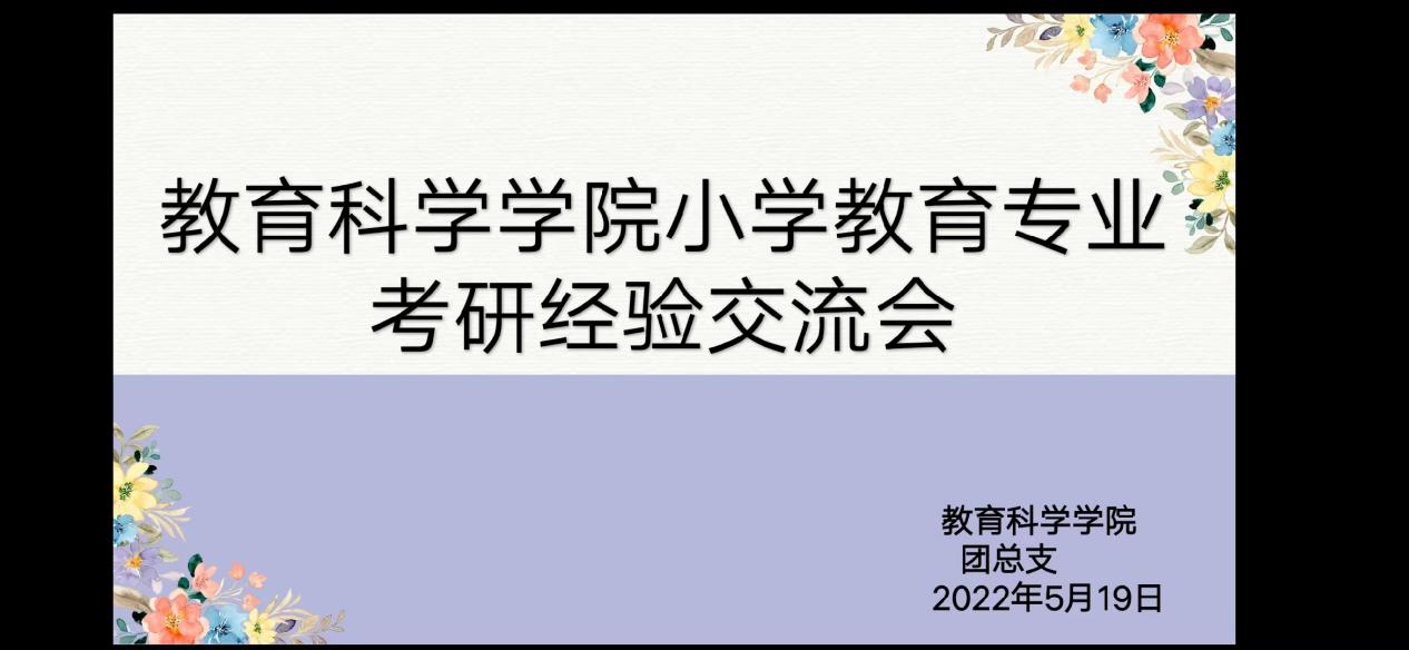 志存高远,方能明前路;取之有道,才可决胜负。随着社会经济发展,就业竞争加剧,使得考研人数日益增多,压力日益加大,为了帮助小学教育专业的同学做好考研规划,解决考研难点痛点,明析考研形势,做好战略战术准备,教育科学学院于2022年5月19日利用腾讯会议线上举办小学教育专业考研经验交流会,2019、2020、2021级小学教育专业160余名学生参加了本次交流会。