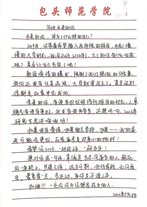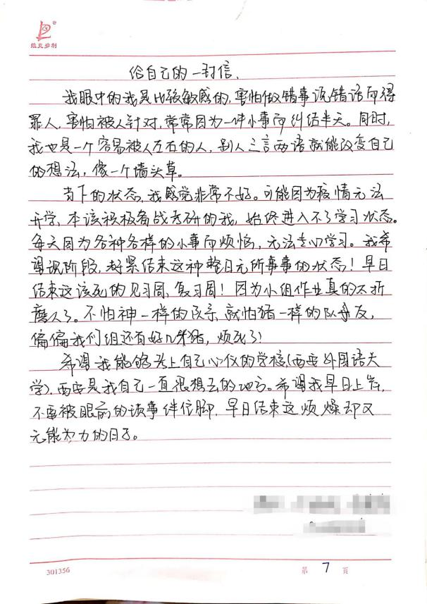 写给自己的一封信,可以写自己的勇敢与善良、孤独与彷徨;也可以写对当前自己的思考、对未来自己的展望;还可以写自己如何看待自己、他人如何评价自己。我们给自己写信的过程,就是认识自我的过程,接纳自己的不完美,并努力向更好的自己迈进的过程。希望每位同学在未来启封信件的时候都能够有所收获,不辜负当初的自己。