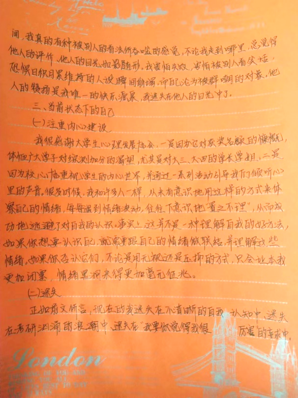 本次“打开心灵的窗户,拥抱美好的明天”——写给自己的一封信活动展现的不仅是同学们的文采,更是每个独一无二的自我的风采。通过无声的文字,同学们与内心最真的自己进行交流。通过文学的表达,将一部分藏在潜意识里的自我表达出来,以书信为窗口窥见平时不善被察觉的自我。(心理咨询中心)