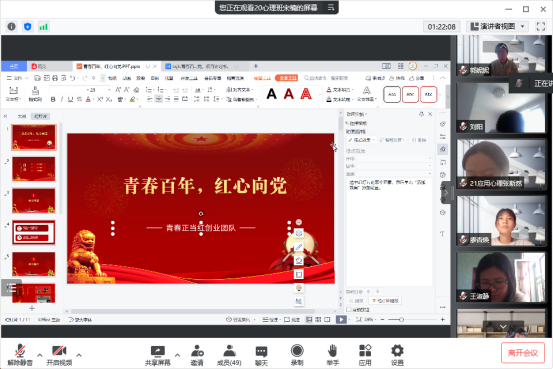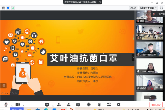 “老年人心理辅导中心”、“青春百年,红心向党”、“非物质文化遗产互动平台”等38个参赛项目通过腾讯会议直播形式依次进行路演,各参赛选手经过前期的认真准备,对项目进行了详细的汇报和讲解,并对专家的提问进行了深入细致的解答和分析,评审专家们分别从商业、团队、创新、就业和引领教育等维度进行打分和点评,中肯地提出项目中存在的问题和改进建议。
