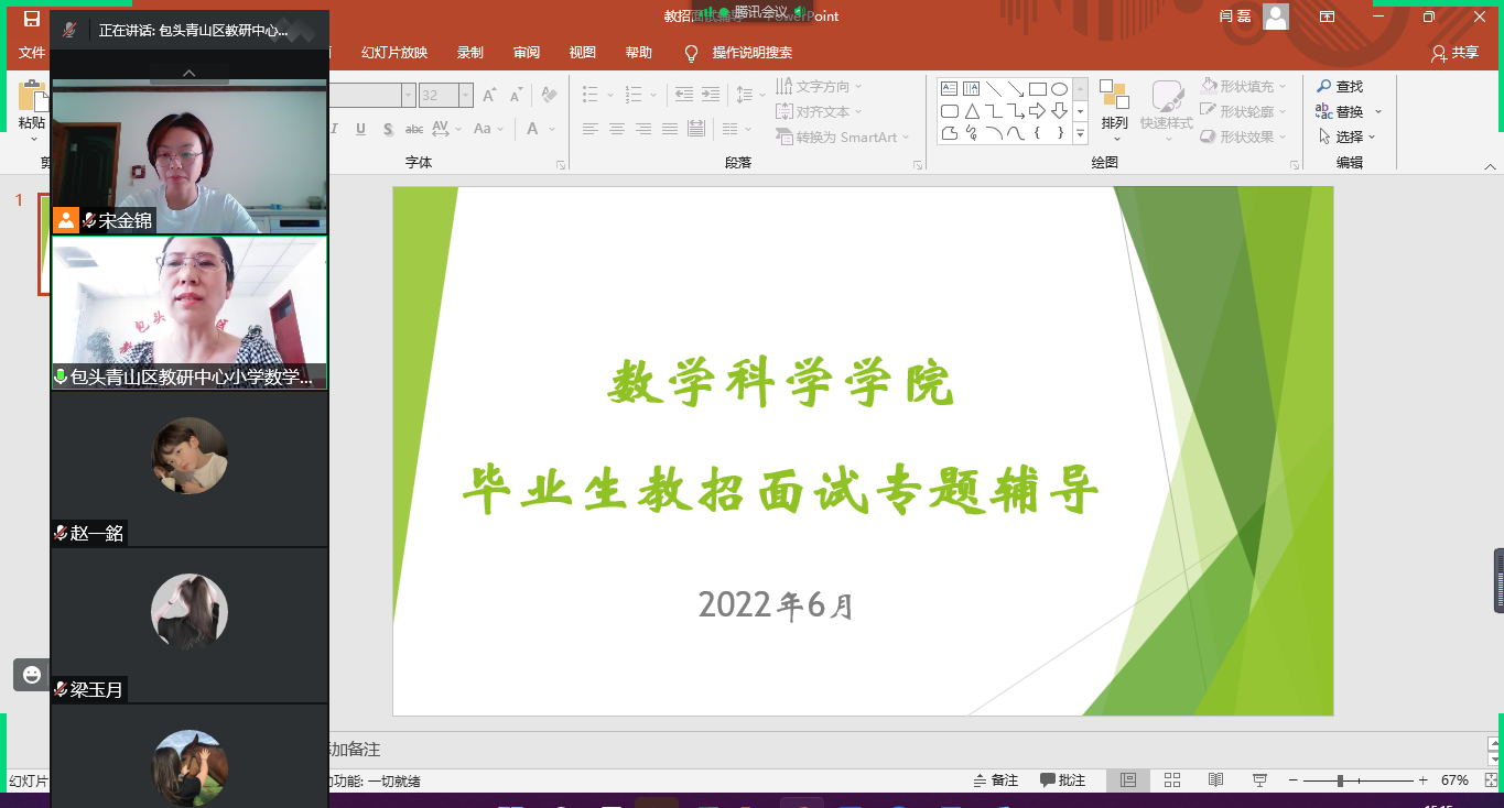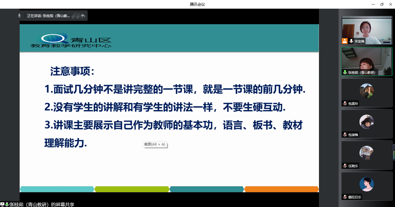 6月14日下午,田红霞老师以小学学段的《长方体的体积》《因数与倍数》两课为例,就如何理解教材、使用教材等备课的环节做了具体讲解与指导。6月14日晚,张桂茹老师结合面试的考评标准,和同学们分享面试经验,强调要在备课中备好教材、试讲中展示自己的语言、板书、教材理解能力等基本功。对于学生们的一些困惑,张老师结合自己录制的云课堂课例,就试讲中如何在有限时间内讲解好重难点、如何设计课堂互动等问题,进行示范。通过与两位指导教师的交流,解答了毕业生关于试讲的困惑,也使得学生以评委老师的角度审视自己的试讲过程,对即将到来的面试树立信心。