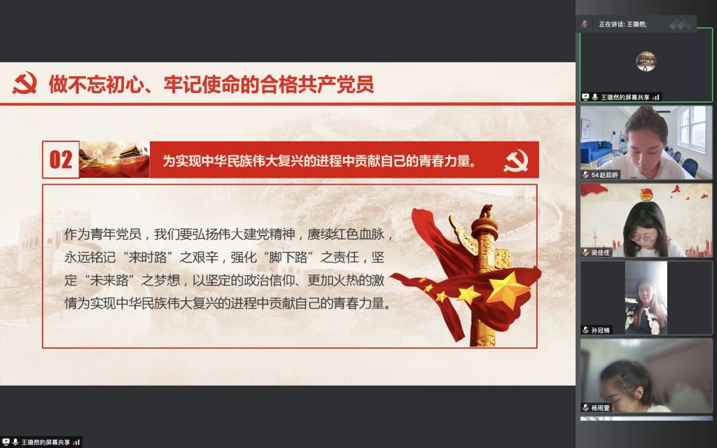 王璐然同志围绕读懂“强国有我”里的“有我”、以青春之“我” 道出“强国有我”的誓言、做“强国有我”的新青年三部分进行阐述,鼓励党员们要做强国路上的有“心”人,承担起民族复兴、实现共产主义的伟大理想,披荆斩棘,继续前进;同时希望全体党员真正明确“信仰”二字的含义,牢记党的光荣历史,从自身做起,在日后的学习、工作、生活中,充分发挥好先锋模范作用。党课结束后,三位学生党员代表进行了交流研讨。她们表示,今后将更加坚定信念,不断加强理论学习,尤其是学好中国共产党党史,努力提高自己的政治素养和思想理论水平,担负起党和人民赋予的重要职责,时时讲奉献,处处有作为,不忘初心,不负韶华,争做新时代合格学生党员,为社会主义现代化建设贡献青春力量,用实际行动迎接党的二十大召开。