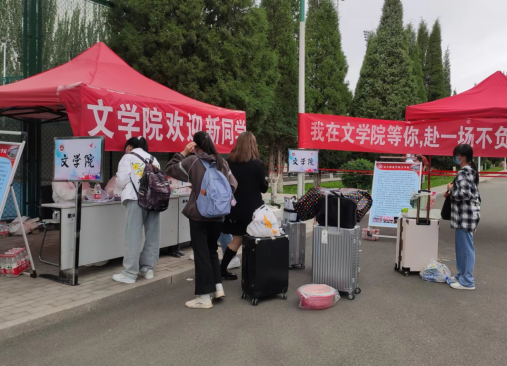 2022级新生需严格按照报到流程入校,服从学校与学院的安排。为更好地服务新生,文学院于南院迎新通道设立迎新服务台,新生凭录取通知书和身份证进行报道。文学院教师贺芬、白斯琴、王晓霞、李静亲临迎新服务台,协调新生接待工作,解决迎新工作中存在的问题,并与新生亲切交谈,坚守在迎新第一线,帮助新生入学报道。文学院学生会组织在校学生成立“迎新志愿服务团队”帮助新生解决行李搬运等问题,用“前浪”带动“后浪”更好更快的融入文学院大家庭。