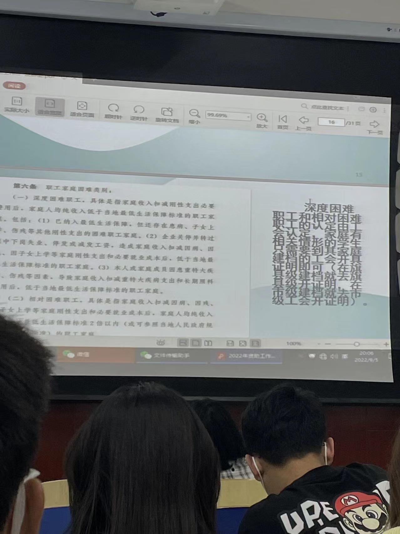 为认真贯彻落实《包头师范学院家庭经济困难学生认定办法》及《学工部关于做好2022-2023学年家庭经济困难学生认定工作的通知》要求,9月5日晚上,政法学院在博学楼东504教室召开了贫困生认定暨学生干部廉政教育会。各班班长、副班长、团支书参加了会议。会上,辅导员赵鹏然老师介绍了认定工作的基本要求,宣读了认定细则以及量化标准,要求各班秉持公平公正公开原则,在奖助学金评审中不得出现轮流坐庄、分摊、分派等现象。