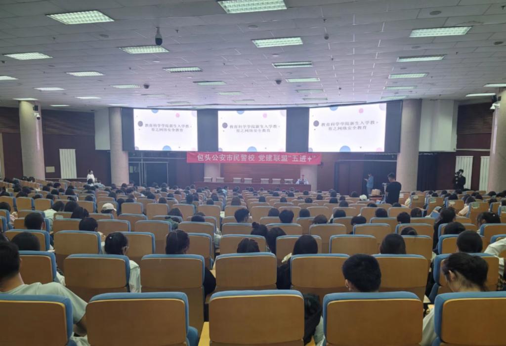 为了加强大学生网络安全教育,增强学生自我保护意识,提高预防网络诈骗的能力,教育科学学院于2022年9月20日在博学楼学术报告厅为2022级新生、各班宿舍长、学生干部做网络安全教育讲座,本次讲座特邀包头市公安局教育培训支队贾立警官,他是公安部双千计划教官、内蒙古警察职业学院高级实训教官、一级警官。