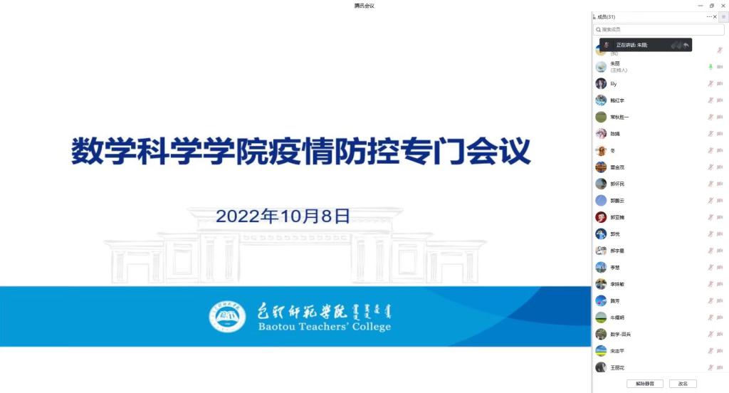 为贯彻落实自治区教育厅、包头市、青山区和学校关于疫情防控工作各项决策部署,传达学校疫情防控调度会议精神,加强学院疫情防控工作,增强师生的安全防范意识,保障师生的身心健康,10月8日晚,数学科学学院党总支书记朱丽主持召开学院疫情防控工作专门会议,会议以视频会议的形式召开,学院全体教师参加了会议。