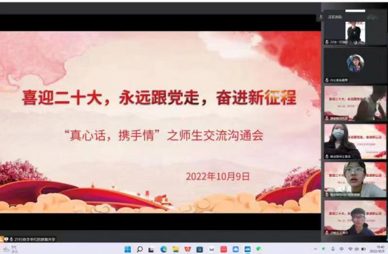 为了迎接中国共产党第二十次全国代表大会胜利召开,营造良好的校园疫情防控环境,增进疫情期间同学们的沟通交流,10月5-10日,政治与法律学院学生干部及2019-2022级15个班级分别举办了线上交流会,各班班主任老师及全体同学参与了此次交流会。