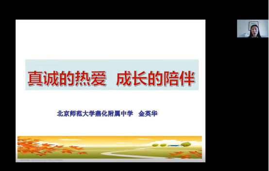 金英华老师认为新时代教师应做到教学、管理、科研三位合一,鼓励同学们勇敢成为一名班主任,并将自己多年授课积累的经验分享给了大家。她以2002级毕业生和2020级学生为例,为同学们详细地阐述了身为班主任拥有共情能力和组织管理能力的重要性。金老师一直秉承着“立足未来培养学生,境界眼光决定高度,热爱奉献实践不停”的教学要求,认为作为一名教师的核心是“用爱心做底色,用智慧作画,小胜在智,大胜靠德”。
