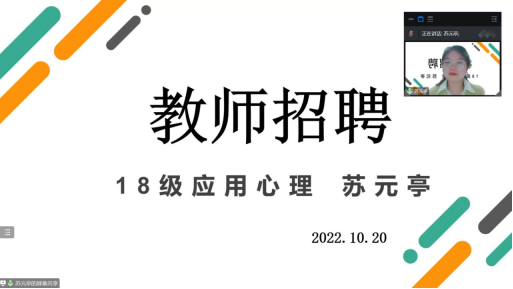 在疫情防控背景下,为确保2019级应用心理学专业学生校内实习工作的顺利开展,同时进一步加强学生对教师招聘相关信息的了解,助力参加“教招”考试的同学成功上岸,10月20日教育科学学院心理系特邀请2018级优秀毕业生苏元亭以线上会议的形式面向心理专业大四同学组织了一场“教师招考”经验分享活动。活动由心理系实践系主任朱利娜老师主持,近50名师生参与本次活动。