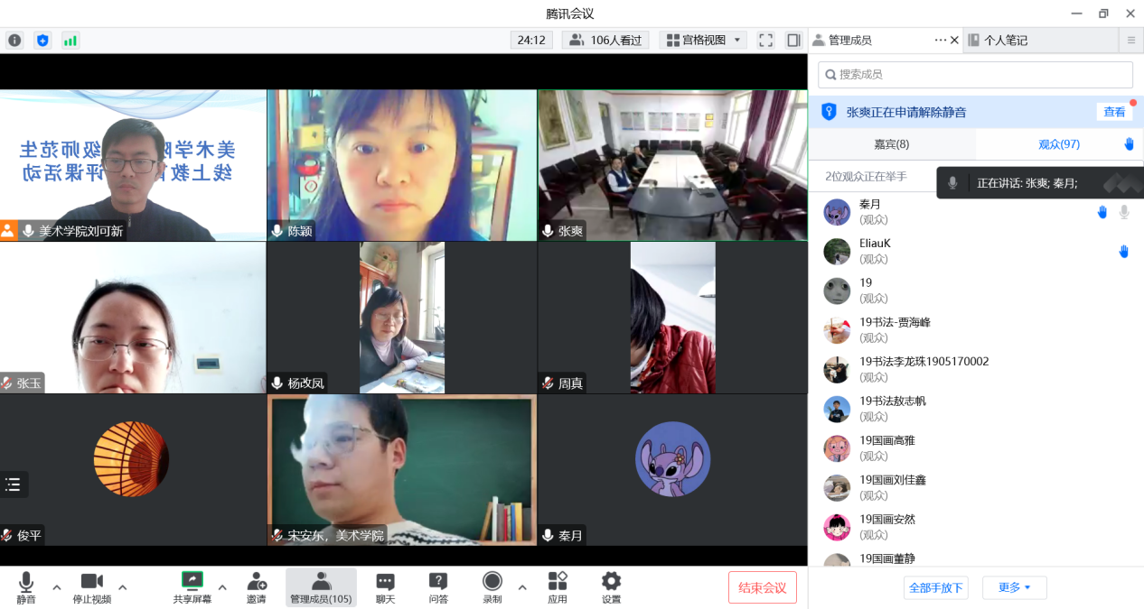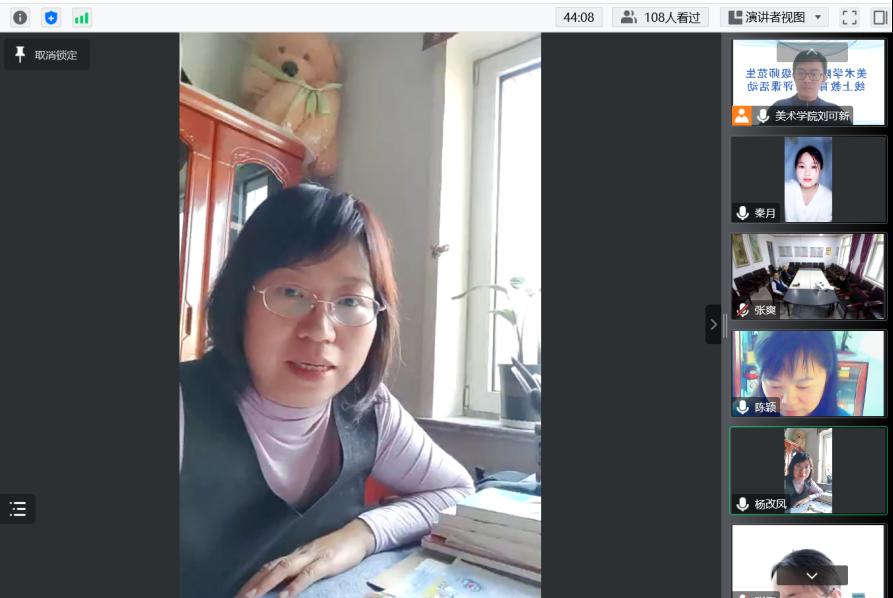 为彰显师范特色、强化师范类学生教学技能、切实增强其课堂教学实践运用能力,10月25日下午,美术学院组织开展线上教育实习评课观摩会。本次活动由美术学院艺术教育系主任刘可新主持,邀请包头市第三十六中学美术教师杨改凤、包钢第十五中学美术教师陈颖分别对6名2019级美术学、书法学专业学生的试讲逐一点评。美术学院领导史继敏、任成达、杨镇宇,教育实习指导教师和90名2019级师范类学生通过腾讯会议观摩学习。