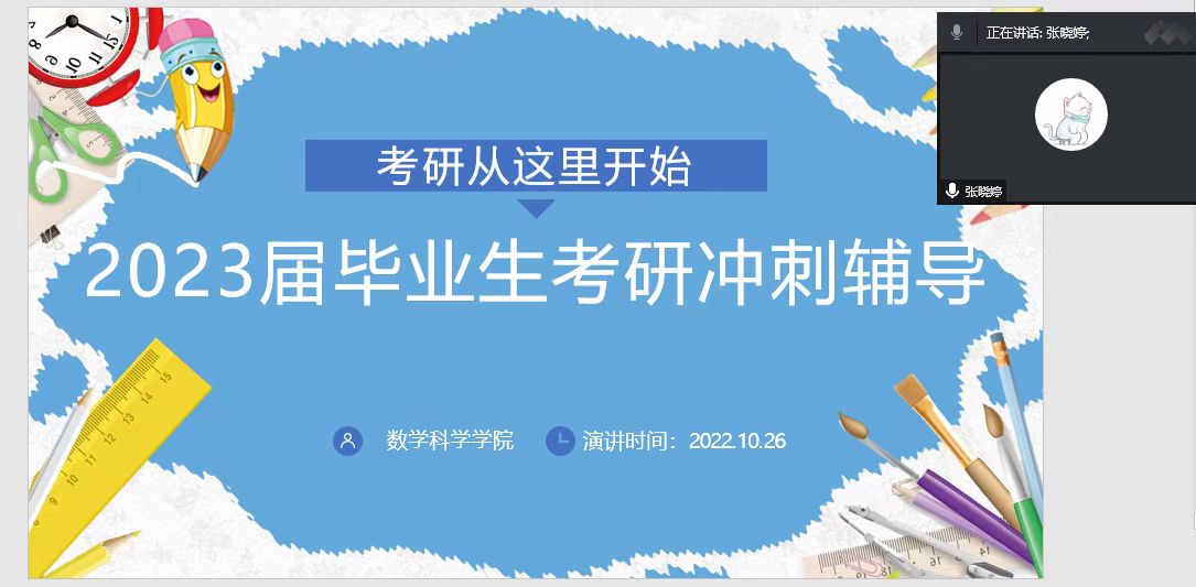 为助力2023届毕业生考研取得好成绩,数学科学学院于10月26日晚召开考研冲刺辅导分享会,邀请就读于内蒙古大学、内蒙古师范大学、山西大学、辽宁师范大学4所高校数学学科相关专业的4位在读研究生校友为2019级考研学生做考研经验交流和冲刺阶段学习方法、心态调整辅导。数学科学学院负责就业工作辅导员郭亚楠主持会议,2019级全体考研学生和部分2020级准备考研的同学参加了分享会。