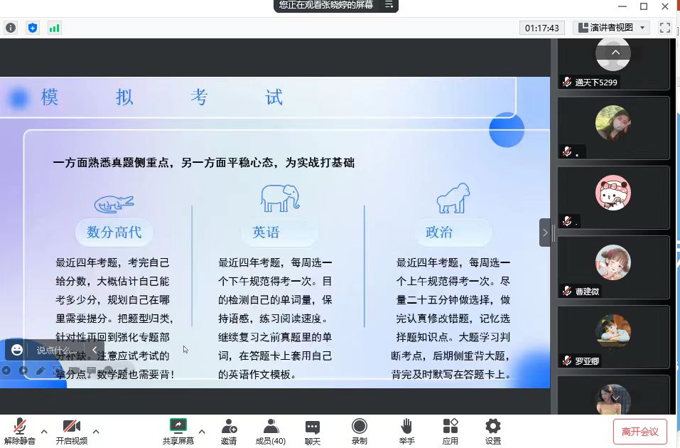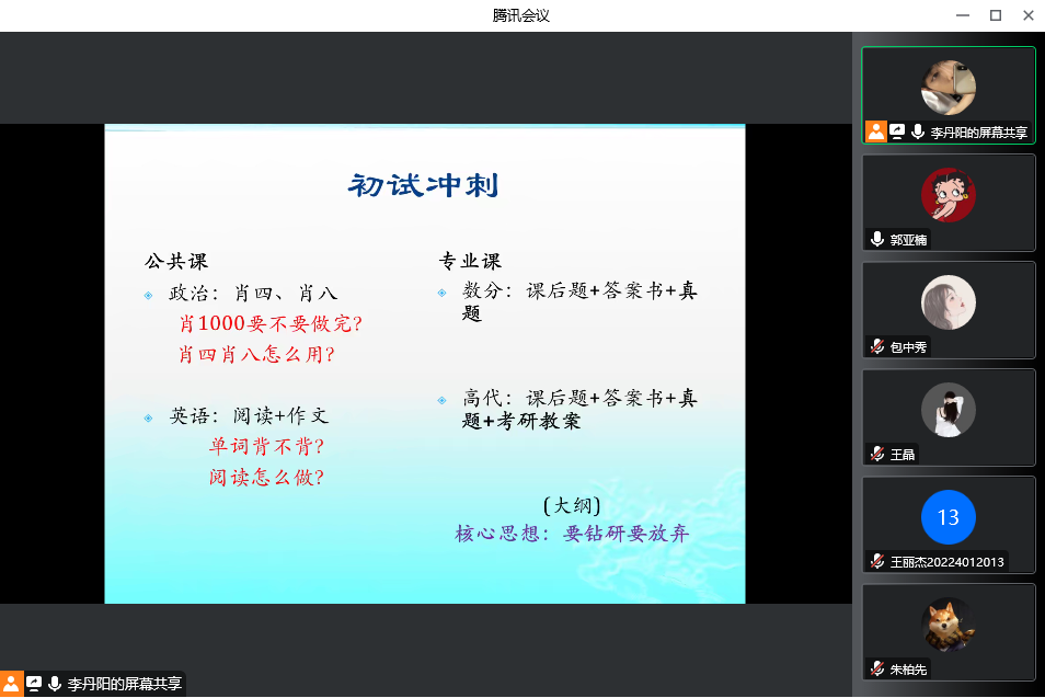 从做出考研的决定,到准备考研,到现在的冲刺阶段,每一位考生都付出了巨大的努力和不懈的坚持,绝不能在爬坡过坎的关键时刻松气歇脚。此次分享会4位学姐针对大家面临的各类问题提供靶向解惑,希望能尽快帮助同学们仔细查找备考的短板和弱项。学院也会持续安排专业教师随时为同学们答疑解惑,争取打通专业知识点的重点难点、卡点堵点,让大家的复习真正取得实效。(数学科学学院)