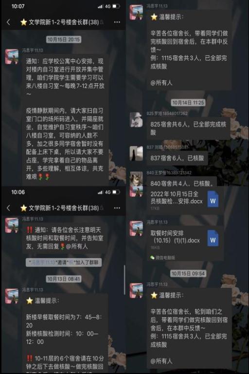 作为新1-2号楼8楼楼层长,19级汉语国际教育刘书慧同学尽全力做好自己的工作:每天提醒大家下楼做核酸、及时消杀并填写消杀表、统计中晚两餐吃饭人数、统计同学们所需的物资并分发、疏导同学们在特殊时期的心情......。起初担任楼层长的她,也会在志愿工作中遇到一些问题,“一开始当层长的时候,对自己需要做的工作不太熟悉,但好在有其他志愿者帮忙分担,这几天好多了,对工作也熟悉了,每天知道自己在什么时间该做什么事,跟大家也熟悉起来。”她用轻松的口吻说道。楼层长的工作虽多,可她却毫无怨言,甚至收获颇多,“首先,经过这段时间的工作,我提升了自己解决问题的能力。其次,在和同学老师们相处的过程中,我锻炼了自己的交际能力,新交了一些本院和外院的朋友。最后,我提高了对自己的把控能力和对时间的分配能力,很好地平衡了学习与工作的关系。”