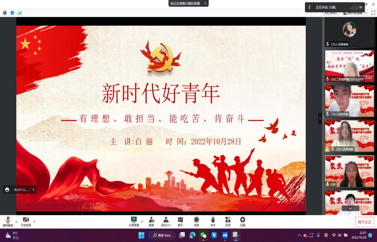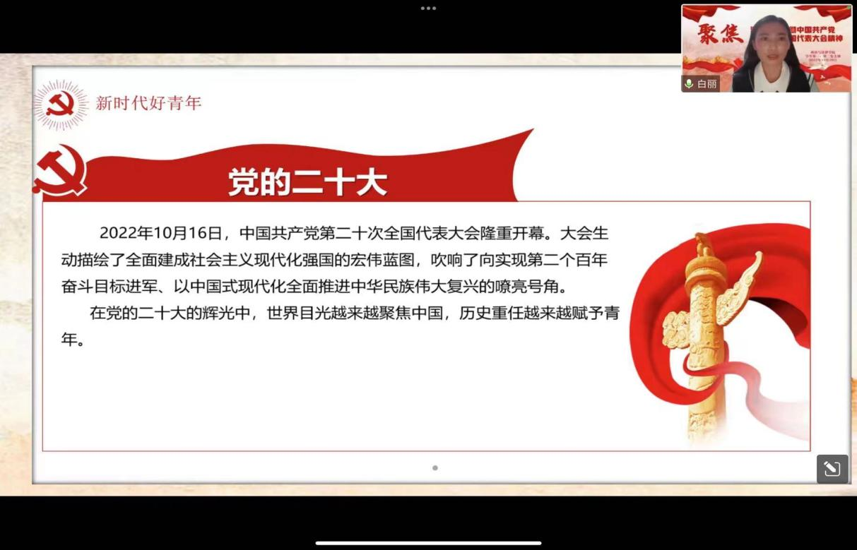 为深入学习贯彻党的二十大精神,引领广大青年坚定永远跟党走的信念,讴歌时代主旋律,传承红色基因,10月28日,政法学院学生党支部召开围绕党的二十大精神召开了以“争做有理想、敢担当、能吃苦、肯奋斗的新时代好青年”为主题的线上专题研讨会。政法学院学生第一党支部书记袁爱荣、学生第二党支部书记白丽、学生党支部全体党员、积极分子和班级代表参加了研讨会。