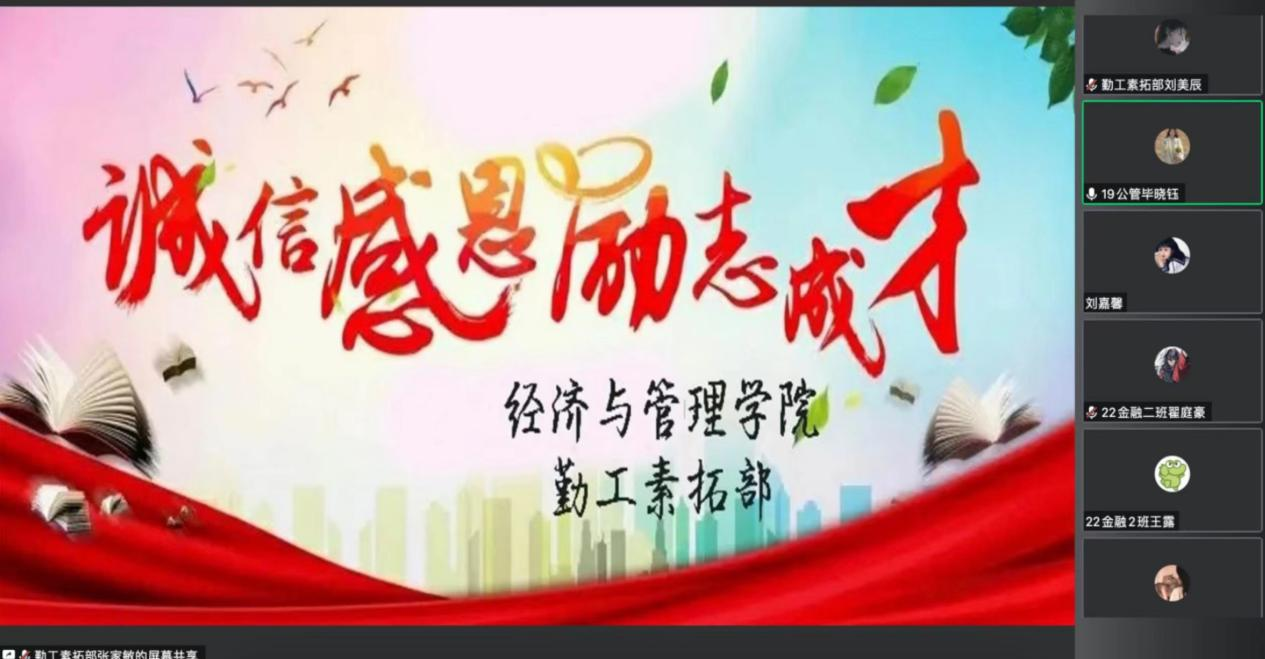 为深入贯彻落实习近平总书记关于教育的重要论述指示精神,进一步深入落实有关学生资助工作,构建和谐互信的美丽校园,10月26日晚7时,经济与管理学院学生会勤工素拓部于线上举办“诚信感恩,励志成才”主题感恩讲座。