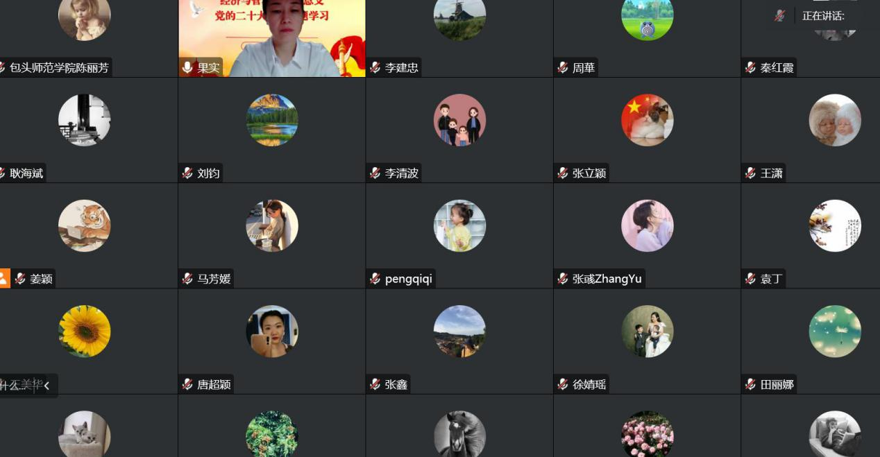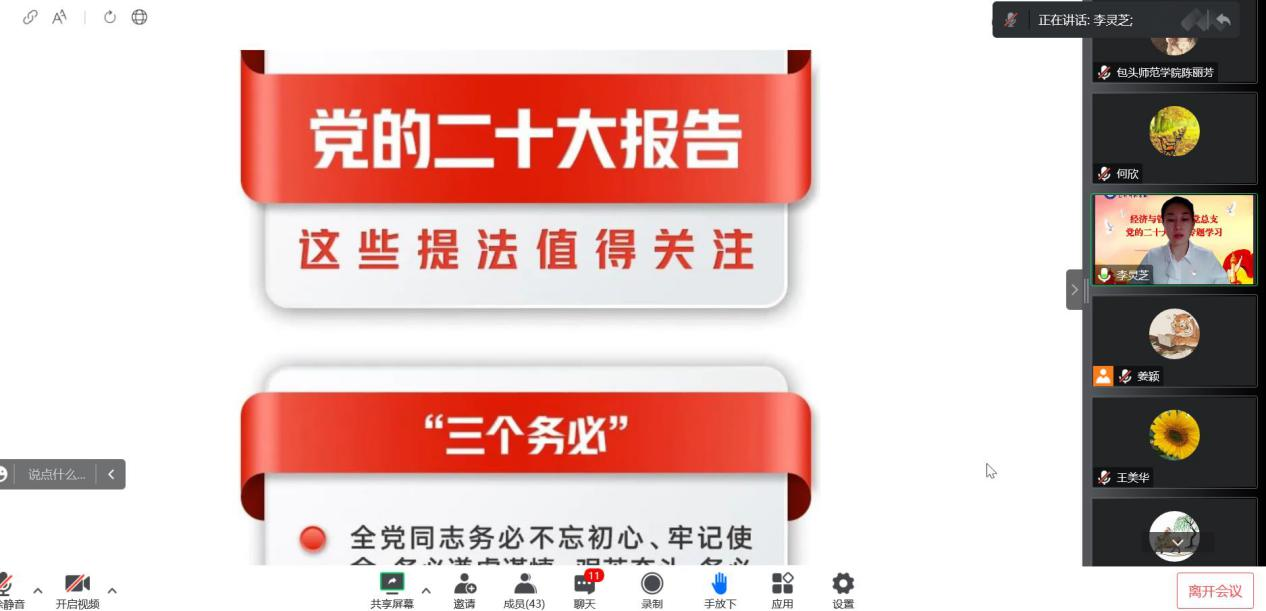 李灵芝强调,学习宣传贯彻党的二十大精神,是当前和今后一个时期全党全国的首要政治任务。经管学院要把学习宣传贯彻党的二十大精神作为重要议事日程,扎扎实实学习好。她带领全体教职工共同从“三个务必” “三件大事 “新时代十年的伟大变革”“第二个答案”“归根到底是两个‘行’”“两个结合”“六个必须坚持”“中国共产党的中心任务”“中国式现代化的中国特色”“中国式现代化的本质要求”“两步走战略安排”“五个重大原则”“全面建设社会主义现代化国家的首要任务、基础性、战略性支撑、应有之义、内在要求、战略要求”“推进国家安全体系和能力现代化”“提高人民军队打赢能力”“健全全面从严治党体系”“坚决打赢反腐败斗争攻坚持久战”“五个必由之路”方面梳理党的二十大报告。李灵芝强调,老师们要将二十大精神体现在课程思政中和课题申报等科研工作中体现;希望老师们重读二十大原文,深入领会精神,把学习贯彻党的二十大精神体现在实际行动和工作成效上。