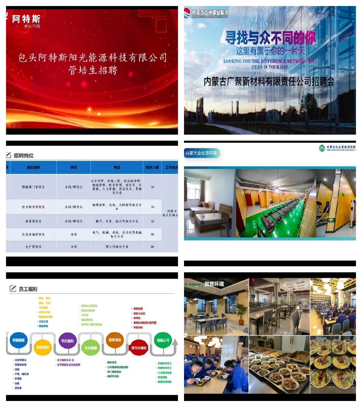 六家优质企业包头晶澳太阳能科技有限公司、内蒙古新特硅材料有限公司、内蒙古大全新能源有限公司、包头美科硅能源有限公司、阿特斯阳光电力集团和内蒙古广聚新材料有限责任公司参加了本次招聘会,企业分别从公司简介、企业文化、产品运营、晋升渠道、招聘职位、员工福利以及工作环境、住宿条件、就餐环境等毕业生急切关注的问题方面做了一一介绍,让毕业生足不出户就能准确了解到所感兴趣企业的方方面面,并能在线上点对点交流感兴趣的求职相关问题,为毕业生求职提供了很大的便利。(招生就业处)