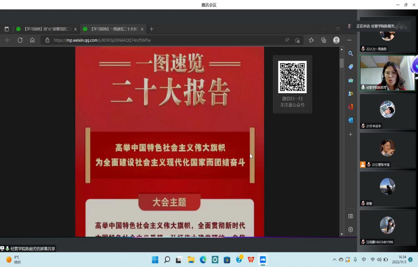 为深入学习宣传贯彻党的二十大精神,强化对学生党员的思想政治引领,经济与管理学院于11月3日下午开展用“心”读懂党的二十大报告党课线上学习。学生第二党支部书记陈丽芳及学生党员共同参与本次线上学习。
