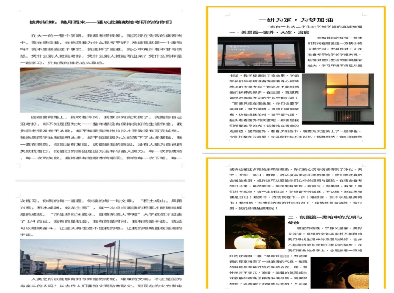 本次活动围绕“一研为定,为梦加油”的主题,通过线上邮件的方式为正在备考的同学们加油鼓劲,用生动的语言为大学生活增加了趣味。在活动开展过程中,同学们积极参与活动,将自己对考研的学长学姐们真挚的祝福都寄予文字当中,活动达到了预期效果。