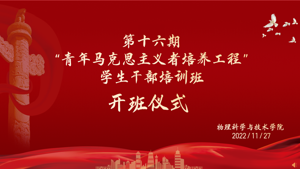 为深入学习贯彻党的二十大精神,进一步加强学生干部思想认识和自身建设,物理科学与技术学院于11月27日晚7点召开第16期青年马克思主义者培养工程暨大学生骨干培训班开班仪式。学院党总支副书记郭凯敏、辅导员郑霞及学院全体学生干部参加了本次培训。