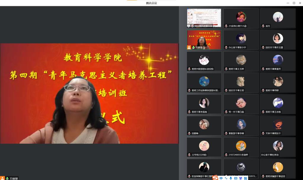 为深入学习党的二十大会议精神,使学生干部和青年骨干坚定理想信念、筑牢信仰之基,教育科学学院于11月30日19:00在腾讯会议上举办第四期“青马工程”培训班第一场专题讲座---二十大会议和报告要点解读。讲座由团总支书记方丽慧主讲,全体学生干部参加了本次活动。