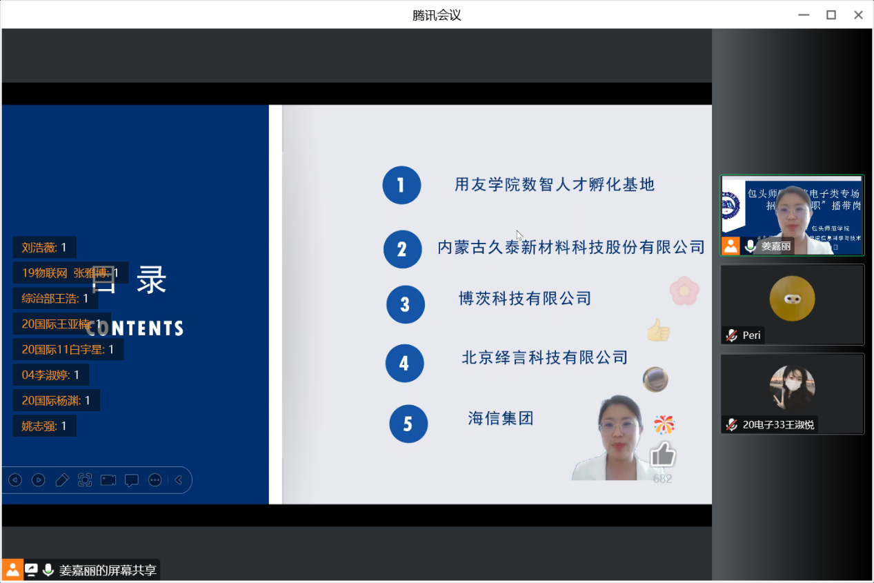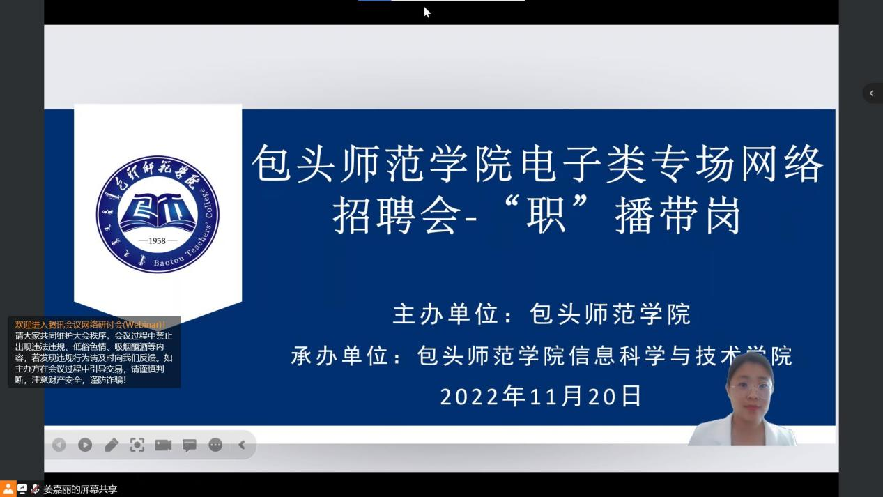 11月20日下午,由学校招生就业处主办,信息科学与技术学院承办,共同组织开展了包头师范学院电子信息类专场招聘会。本次“职”播带岗活动由信息学院辅导员姜嘉丽老师担任主播。