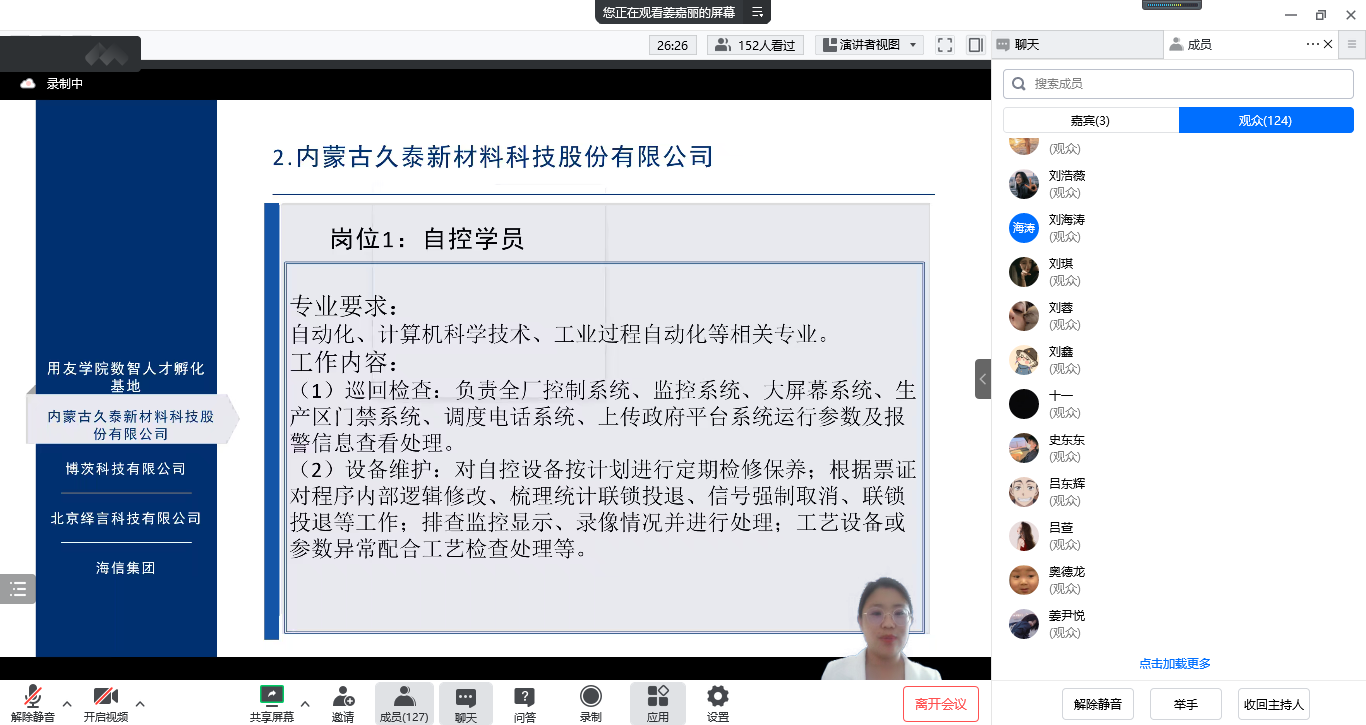 招聘会上,姜嘉丽老师分别从企业的基本情况、招聘岗位、薪资待遇等方面为同学们进行详细讲解,并就学生提出岗位需求、工作地点、签约政策等问题进行了耐心细致的解答。会议中,学生参与热情高涨,共有190多名同学线上观看了直播。(信息科学与技术学院)