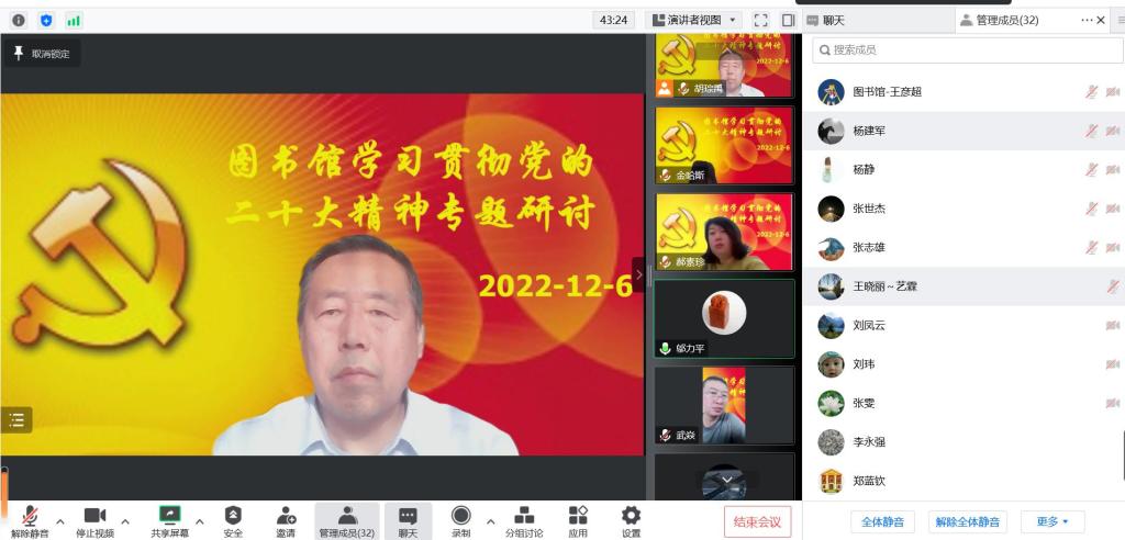 12月6日下午,图书馆通过腾讯视频会议的方式组织全体教职工召开了学习贯彻党的二十大精神专题研讨会,会议由党总支书记、馆长胡琮禹主持。