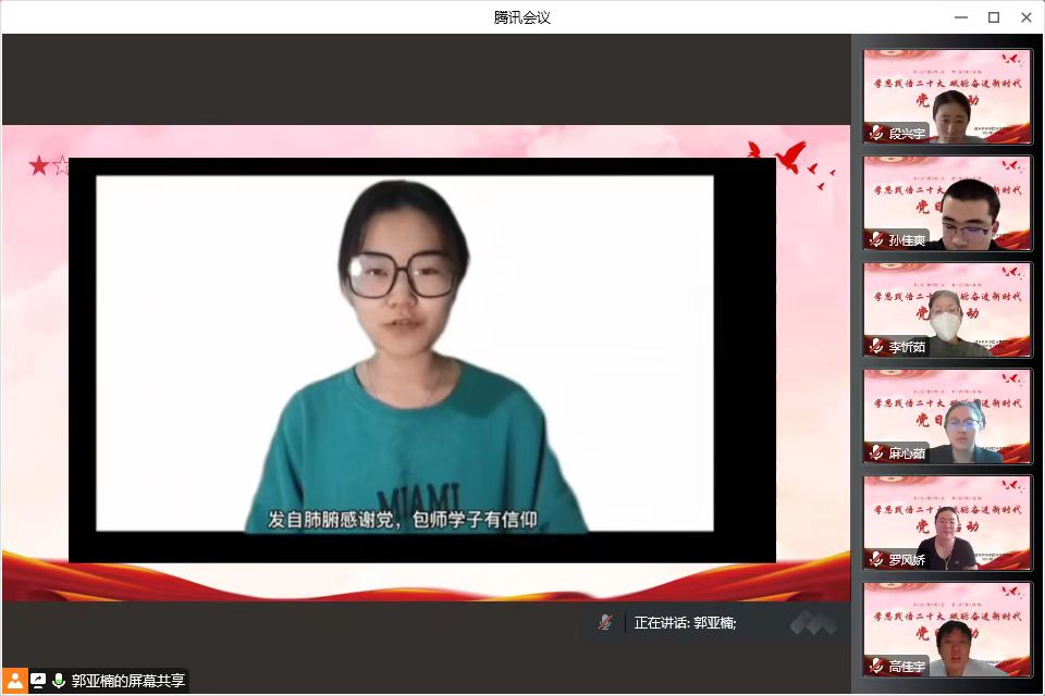 按照学校《党委组织部关于开展2022年组织生活观摩检查暨校级“最强党支部”验收工作的通知》的要求,数学科学学院学生第二党支部于12月8日开展“学思践悟二十大,砥砺奋进新时代”主题党日活动。活动邀请到文学院学生第二党支部书记张兴旺、历史文化学院学生党支部书记白禄和政治与法律学院学生第一党支部书记袁爱荣进行线上观摩,由支部书记郭亚楠主持,全体学生党员参加。