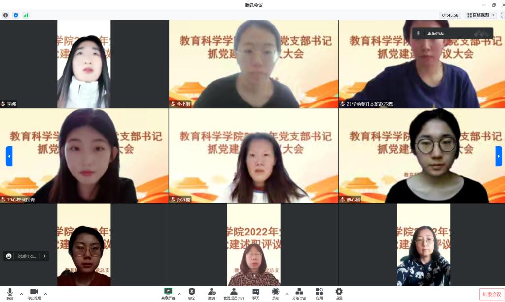 根据《党委组织部关于做好2022年度党组织书记抓基层党建述职评议考核工作的通知》要求,2022年12月9日下午15:00,教育科学学院在腾讯会议召开党支部书记抓党建述职评议大会。教育科学学院党总支委员、党支部书记、全体党员教师和20名学生党员代表参加了会议。会议由党总支副书记李燕主持。