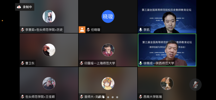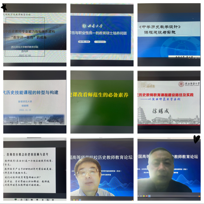 2022年12月10-11日,由北京师范大学历史学院和教育部中学教师教育研究虚拟教研室主办的“第三届全国高等师范院校历史教师教育论坛”以线上会议的方式进行,国内近两百位高校历史课程论教师参会,就高校历史教师教育研究展开了热烈的研讨。我校历史文化学院李慧茹老师和2019级历史班师范生王佳颖同学参会。