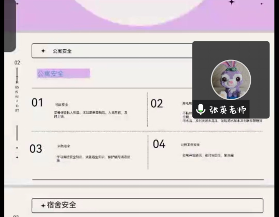 为贯彻落实我校开学第一课文件通知精神,让同学们更快的适应校园生活,以饱满的精神状态迎接新的学期。2023年3月6日晚7点,我院辅导员张英老师以腾讯会议为平台面向全院学生开展了2023年春季学期“开学第一课”主题会议,第一课以“校园安全”为主题从四个方面进行了讲解。