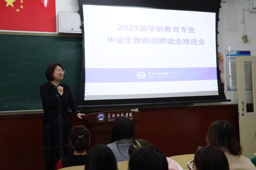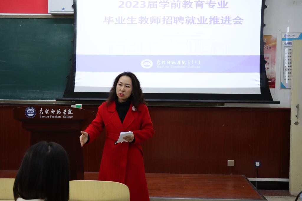 2023年3月昆都仑区面向包头师范学院定向招聘幼儿教师公告发布后,为解答教师和应往届毕业生的相关问题,教育科学学院于2023年3月2日召开了2023届学前教育专业毕业生教师招聘就业推进会。招生就业处处长吕煜瑜、教育科学学院院长李芳、党总支副书记李燕、辅导员、全体毕业班班主任和2023届全体学前教育专业毕业生参加了此次会议。