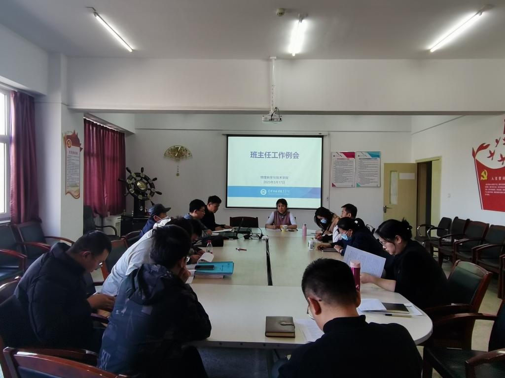 3月17日下午,物理科学与技术学院召开班主任工作例会。党总支书记李慧龙、全体班主任、学工办辅导员参加会议,会议由党总支副书记郭凯敏主持。