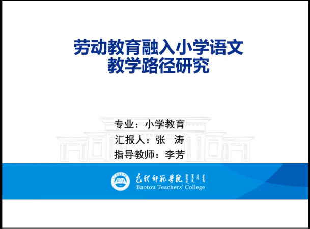 2023年5月25日晚,教育科学学院举办“研究生论坛”。论坛由教育科学学院李芳院长主持,2022级小学教育专业硕士研究生张涛做了题为“劳动教育融入小学语文教学路径研究”的学术分享,学院全体研究生和部分教师通过腾讯会议方式参加了论坛。