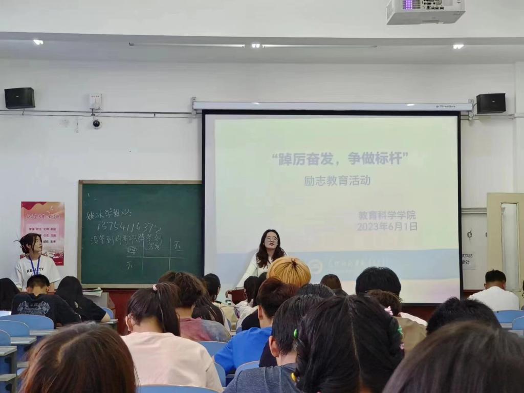 为深入学习贯彻习近平新时代中国特色社会主义思想主题教育,持续抓好学风班风建设,讲好成才故事,树立优秀学生典型,充分发挥榜样辐射作用,激发同学们奋发向上,励志成才。6月1日下午教育科学学院在博西104、博东311、博东407举办“踔厉奋发,争做标杆”励志教育活动,2022级全体学生参加。